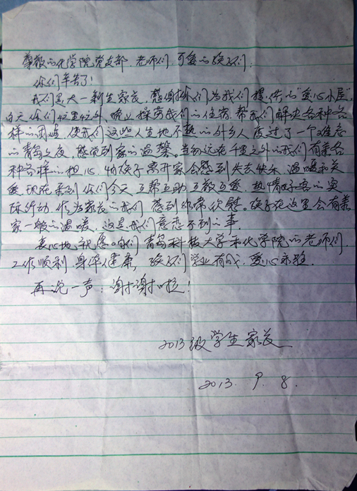 9月11日,伟德国际bevictor1946分团委收到一封从湖北寄来的感谢信,寄信人是一名今年刚刚入学的新生家长,信中表达了对学校和学院迎新工作的感谢,特别表达了对“爱心小屋”温馨服务的感谢。