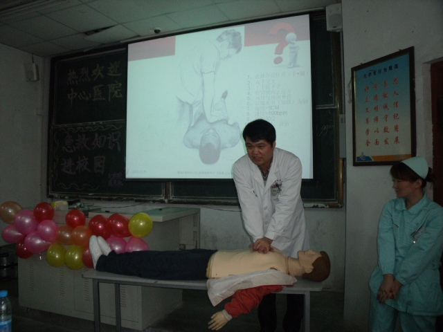 活动开始前,腾伟向同学们介绍了学校和医院良好的合作共建关系,向长期以来定期到医院做义工的伟德国际bevictor1946感恩社志愿者表示了感谢,并向他们颁发了“2013年优秀社会志愿者”的证书。讲座中,于波涛医生就如何拨打120、现场第一时间急救的意义、现场急救的基本流程、常见急危症的现场急救、正确处置伤员体位、伤员检伤方法、现场心肺复苏操作技术、创伤四项急救技术(止血、包扎、骨折固定、搬运)、现场就便器材的使用和现场急救的组织实施等方面进行了讲解,带领同学们学习在发生溺水、触电、烫伤烧伤等紧急情况下正确处理的方法。朱秀秀护士现场指导了同学们利用人体模型对心肺复苏操、气管异物清理等。魏莉莉医生结合中医针灸向同学们介绍了中医保健知识。