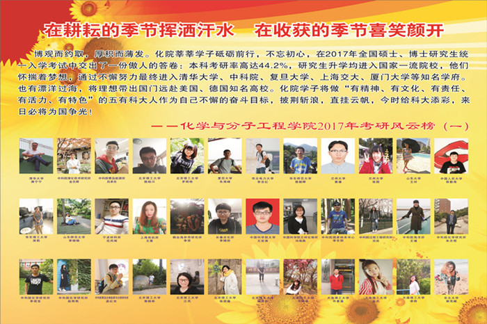 榜样风采,引领成才路。伟德国际bevictor19462017届本科毕业生共有364人,其中162人被中科院研究所、吉林大学、武汉大学、南开大学、大连理工大学等知名院校录取,考研升学率为44.5%。此外,有16名同学考取博士。为凝聚榜样青春力量,激励化院学子争做科大“五有”青年,开展考研风云榜展示活动,并通过“微观化院”微信平台与全院同学进行互动,通过高年级对低年级的辐射连带模式,充分发挥青春榜样的引领作用。