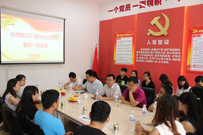 上好最后一堂党课。学院在“五星党苑”党建活动室开展“毕业生党员最后一堂党课”主题教育活动。党总支书记王德宝给毕业生党员上离校前最后一次党课并寄语毕业生党员:“一个党员就是一面旗帜,祝福你们前程似锦,要常怀感恩之心,感恩父母、感恩老师,勇于担当一名当代优秀共产党员的责任和义务”。党总支副书记张壮勉励大家要志存高远,以自己实际行动在各自的岗位上彰显五有科大人的精气神。副经理胡志强希望各位党员,在新的环境中认真践行“两学一做”精髓,将在科大的积淀应用到实际生活中,勇攀高峰。