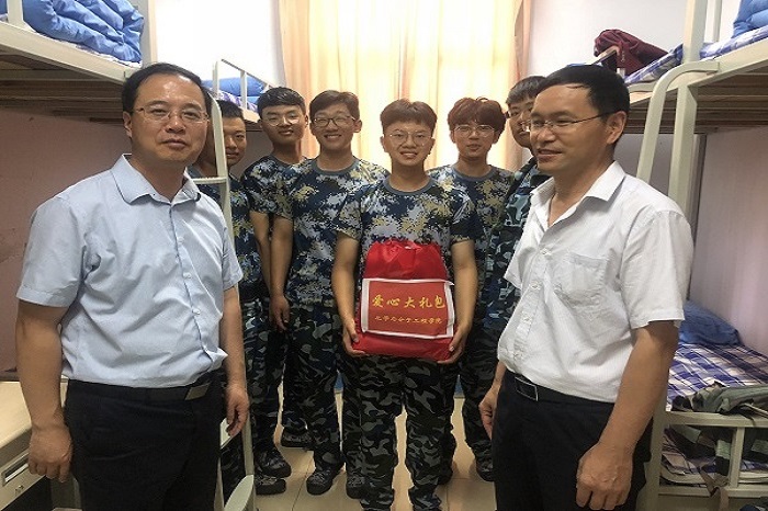 9月3日上午,为了点燃同学们军训的热情,伟德国际bevictor1946经理罗细亮、总支书记王德宝、光电传感与生命分析教育部重点实验室主任丁彩凤、副经理高洪涛、副经理胡志强、党总支副书记兼副经理张壮来到东山操场看望19级新生们。