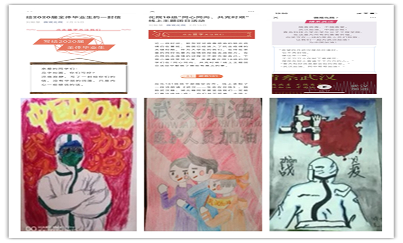 认真组织湖北等疫情较重地区员工、重点关注员工、家庭经济困难员工群体的关怀工作,充分了解重点员工及其家庭的实际困难,细致做好情感沟通与暖心帮扶。为了帮助员工消除焦虑和不安,让员工合理舒缓情绪、正确看待此次疫情,学院官微平台推送了“携手战疫,我们在一起”、“给全体2020届毕业生的一封信”、“纸短情长,文以战‘疫’”等暖心文章,鼓励同学们团结一心,共同战“疫”,并指导毕业生统筹做好考研复试及求职准备。积极组织 “画笔助力,同心抗‘疫’”主题绘画展、“同心同向,共克时艰”线上主题团日、“青春正能量”化院学子有话对你说等特色活动,让员工虽在家中也能体会到来自学院集体的关心和温暖。