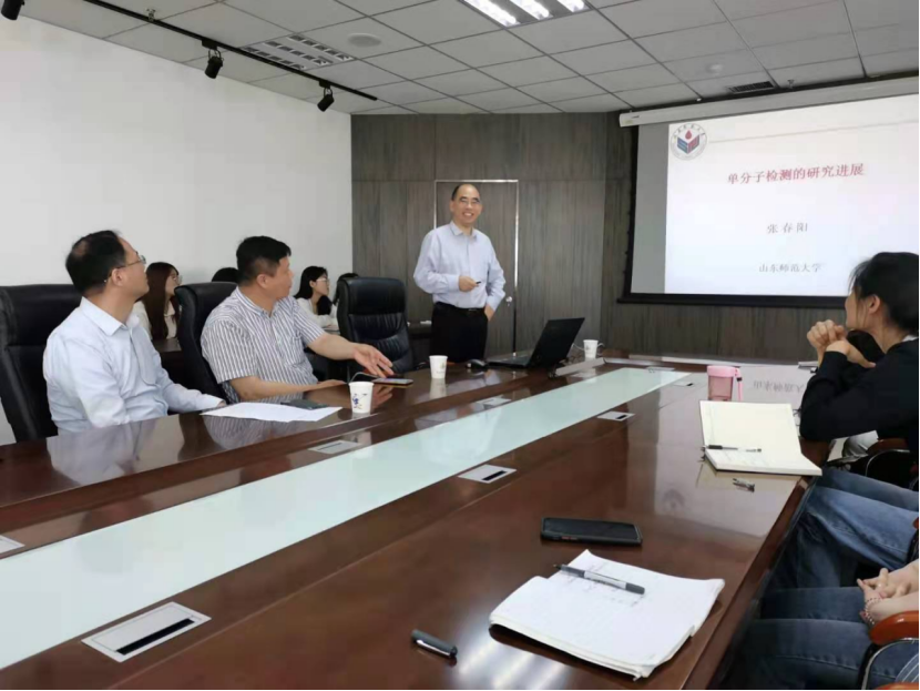 2021年5月24日上午,山东师范大学张春阳教授做客伟德国际bevictor1946,为广大师生作了题为《单分子检测及其应用研究进展》的学术报告。报告活动在CCE大楼1505会议室举行,由伟德国际bevictor1946经理罗细亮教授主持,光电传感教育部重点实验室执行主任丁彩凤教授等分析化学专业相关师生出席。