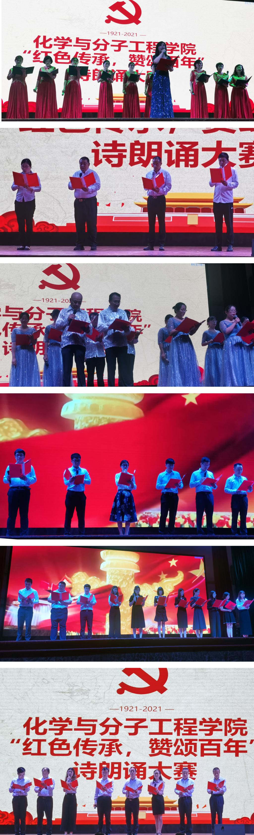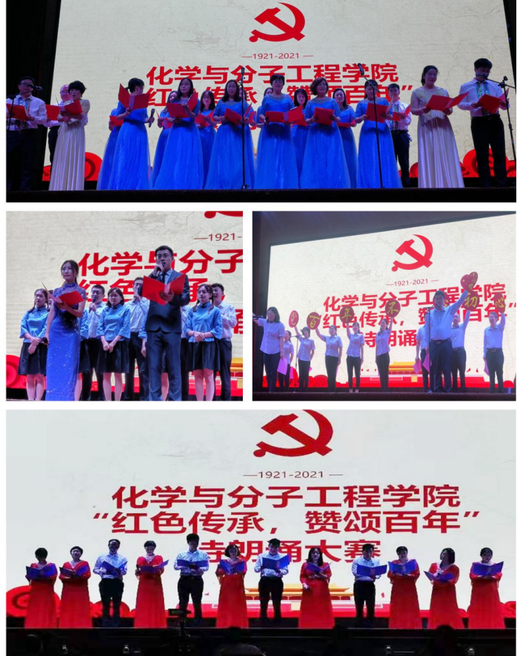 “100年的历史,令人振奋,令人激昂。100年的历史,一座历史的丰碑,铭记了时代的辉煌”“这是一个民族,攥紧的铁拳,锻造出砸碎枷锁的铁锤。”“有人问 “哪里是你的家,我回答 ,向东方走,有个美丽的地方叫中华!”……比赛中,来自10个教研室的参赛老师在院工会的组织下,通过集体诵读等方式,展现百年党史的波澜壮阔,讴歌共产党人在磨难和淬炼中奔涌向前、走向胜利的英雄事迹。基础化学实验中心的《丰碑》、分子科学与工程教研室的《伟大的旗帜》、办公室分团委以及重点实验室《红旗颂》为我们诵读了中华儿女英勇顽强,他们的英名,筑起一座民族的丰碑!写就不朽的篇章!还有领导班子的特别朗诵《热爱祖国忠于党》,追忆峥嵘岁月,歌颂百年风华,用诗歌抒发对党和国家的深情厚爱。