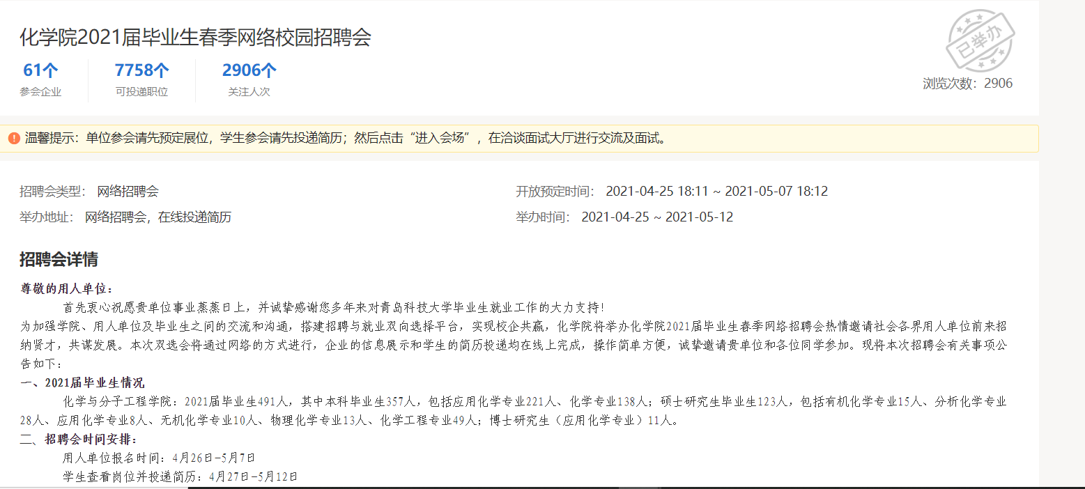 为了确保本次网络招聘会的成功举办,学院提前通过校园就业信息网发布双选会预告,广泛邀请用人单位参会,将通过审核的用人单位和毕业生信息提前输入系统,做到精准对接。本次招聘会共有65家企业参加为毕业生提供了7758个岗位,岗位与毕业生比例为16:1。