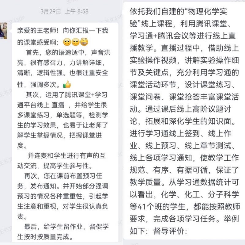 与会老师首先对于校园封闭化管理以来的化学实验课程线上教学情况进行总结,交流经验做法,发现问题短板。疫情防控常态化校园封闭化管理背景下,伟德国际bevictor1946基础化学实验中心依托自建《无机及分析化学实验》《有机化学实验》和《物理化学实验》三门山东省联盟在线开放课程和学银在线开放课程,适时启动线上教学。学院教学督导唐林老师介绍了基础化学实验课程的督导工作和教学评价情况,各位线上督导员对实验课老师们的创新授课做法和实验课程效果给予高度评价。基础化学实验中心的《物理化学实验B》《有机化学实验》 获批山东省线上线下混合式一流本科课程,课程建设的经验做法和教学改革的实践历程为化学人才培养工作提供了有力支撑。