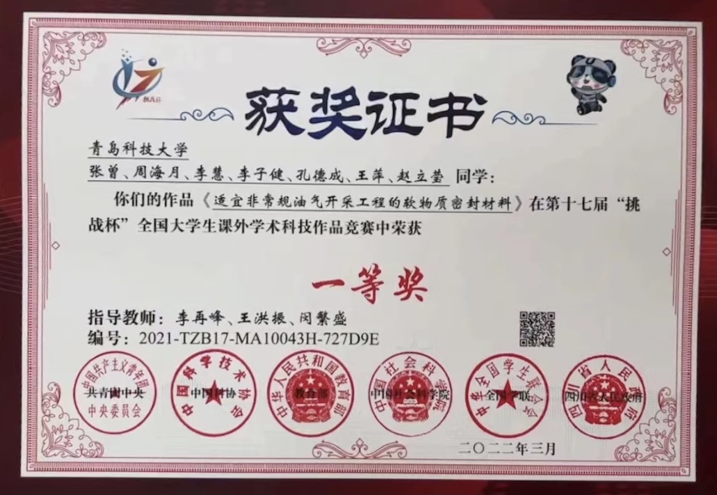 3月29日,第十七届“挑战杯”全国老员工课外学术作品竞赛落下帷幕,我院研究生张曾等同学完成的参赛项目《适宜非常规油气开采工程的软物质密封材料》(第一指导教师:李再峰)荣获全国一等奖,全国共109项。这是学校首次跨进“挑战杯”系列竞赛“全国一等奖”行列,创造了历史最好成绩、实现了赛事重大突破、挺进了全国第一方阵。
