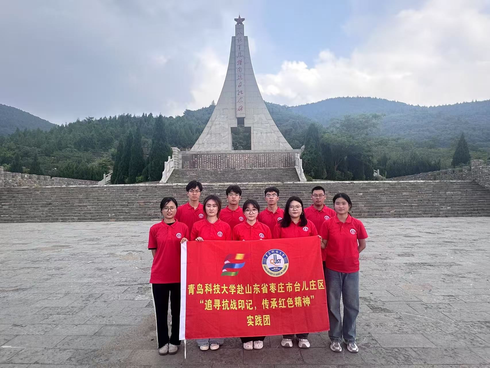 实践队队员们站在八路军抱犊崮抗日纪念碑前,体会到了八路军在鲁南地区艰苦斗争中凝聚的军民鱼水情深的革命精神。
