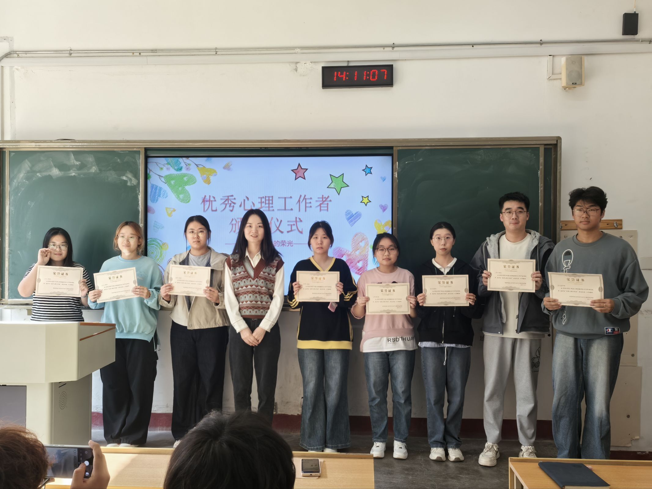 马晓风老师为2024-2025学年度学院 “优秀心理工作者”颁发证书,表彰他们在心理服务工作中的积极贡献,同时也为新成员树立了学习榜样。