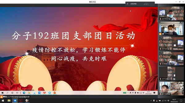 线上红色放映厅,党史教育不能停。为进一步强化党史学习教育,增强团支部的凝聚力,分子192班团支部利用线上腾讯会议开展了“线上红色放映厅”团日活动。在此次活动中,班长刘德发同学向全体同学讲解了学校最新的防疫要求和防疫条例,随后,全体团员通过观看红色视频,进行了党史学习教育。通过观看党史纪录片和战疫纪录片,同学们认识到了积极配合疫情防控工作的重要性,学习了党的百年成就,也看到了党员在疫情防控工作中发挥的先锋作用,进一步提升了同学们对党史和党的理论的学习在实践中的感悟,理想信念也更加坚定。